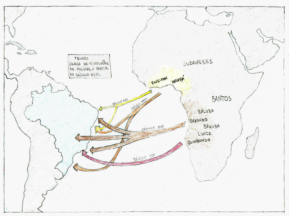 The first diaspora that can be characterized as such is the one of enslaved Africans brought to Brazil [2]. From the 17th century on the model for the establishment of colonies in the New World using the manpower of the African slave turns dominant, substantially linked to the economic strength of the transatlantic slave venture. About four million people were in the course of four centuries expatriated to Brazil, mainly belonging to two major ethnic-linguistic groups: the Bantu, belonging to various ethnic groups in South Central Africa, especially from those areas that today form Angola, Congo and Mozambique; and the Sudanese from West Africa, mainly from the region of today Nigeria and Benin, here called Jêje-nagôs. The concentration of enslaved Africans in the economically most productive areas of Brazil took place differently for the Bantu and Sudanese, temporally and spatially, following the whim of alliances between traffickers and local leaders, the price associated with the ethnic origin of the enslaved individual, the demand for certain skills that were assigned to them (skilled labour power), among other factors. So we have in the 17th century until the second half of the 18th century a continuous flow of Bantus, even more vigorously in the 19th century, practically almost until abolition. The Sudanese, which were deported to Brazil in small numbers already in the 16th century, come in larger scale in the second half of the 18th century [3].